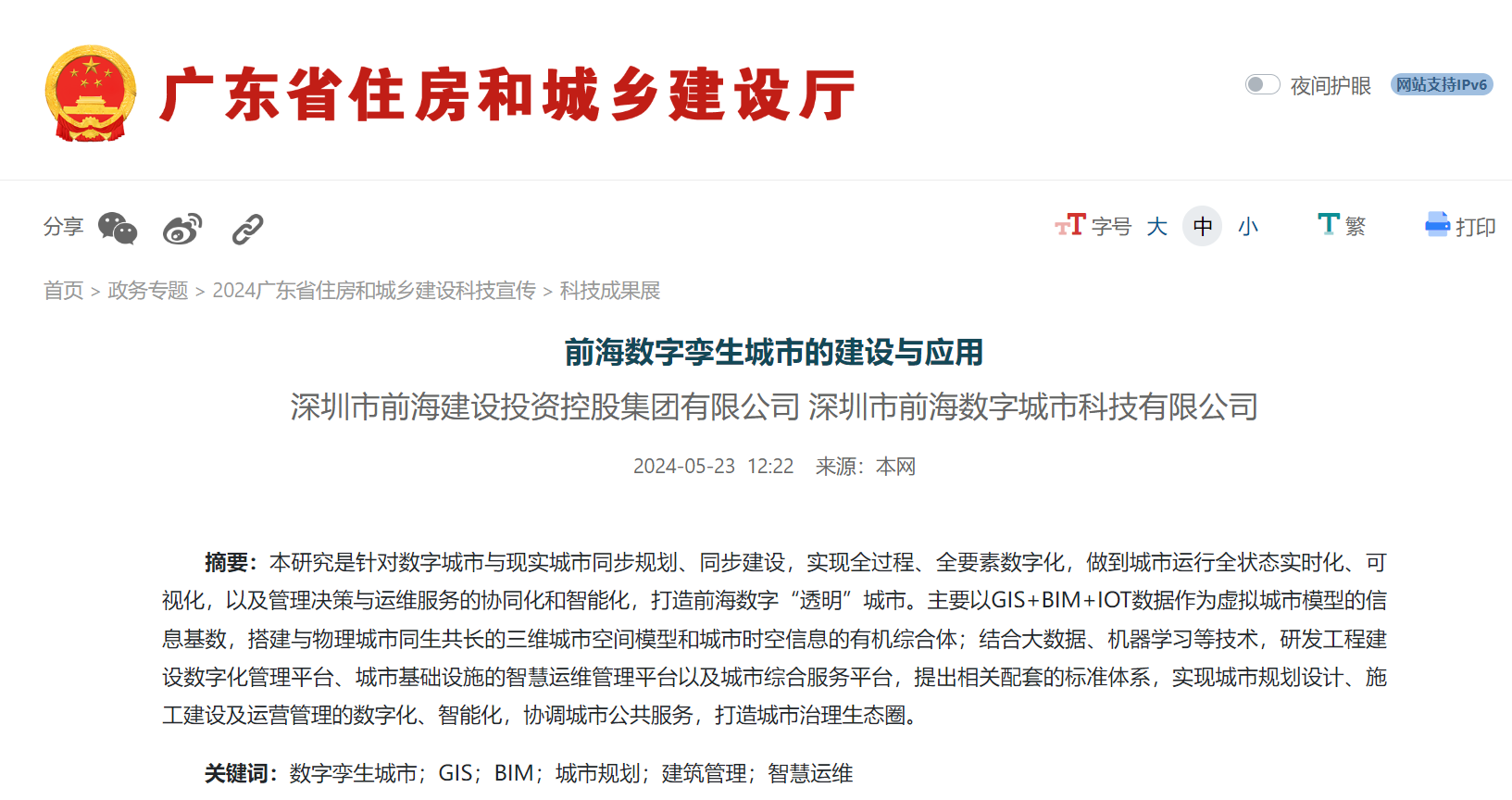 近日,由前海建投集团及前海数科共同承担的住建部科技示范项目《前海数字孪生城市的建设与应用》作为本地区先进示范案例,荣登广东省住房和城乡建设科技宣传之科技成果展,展现了智慧城市建设的最新成果!